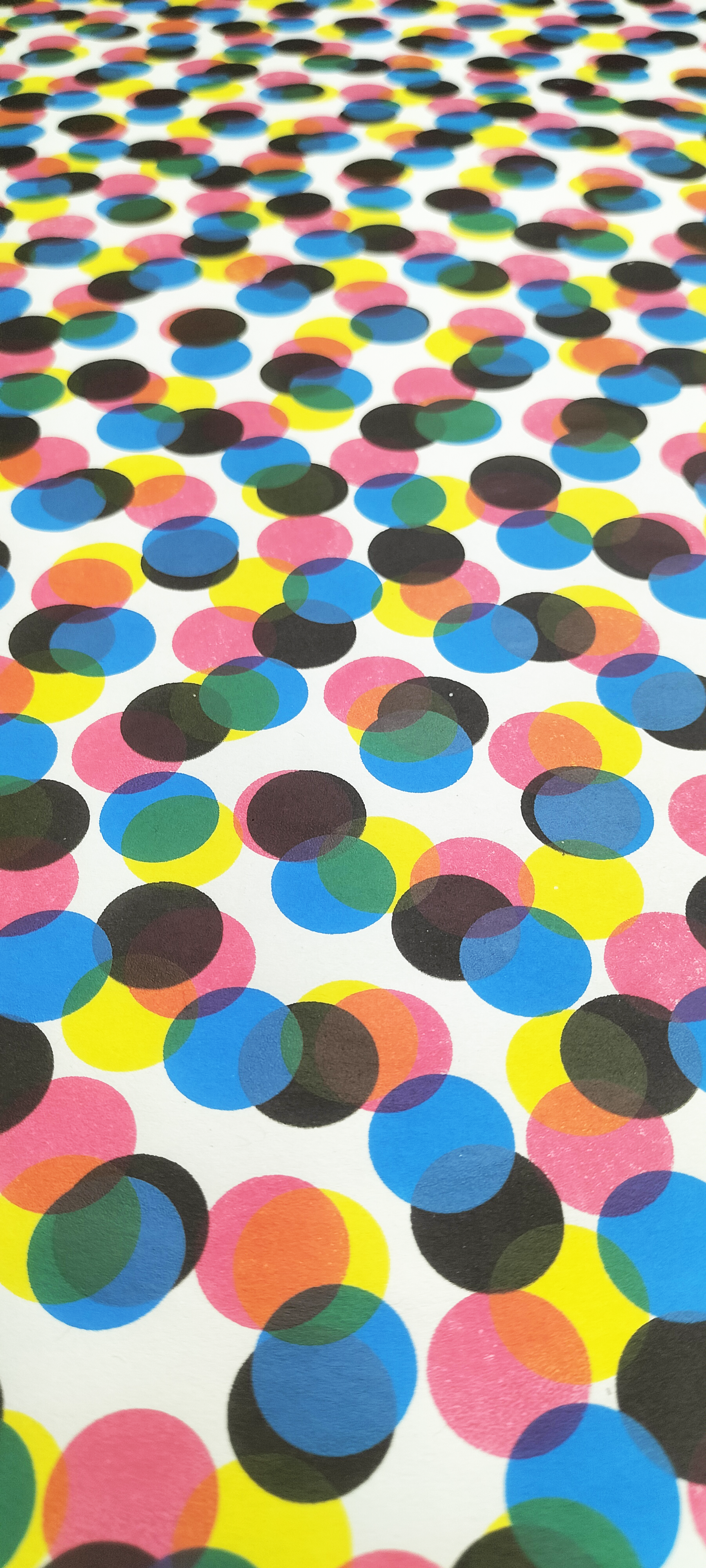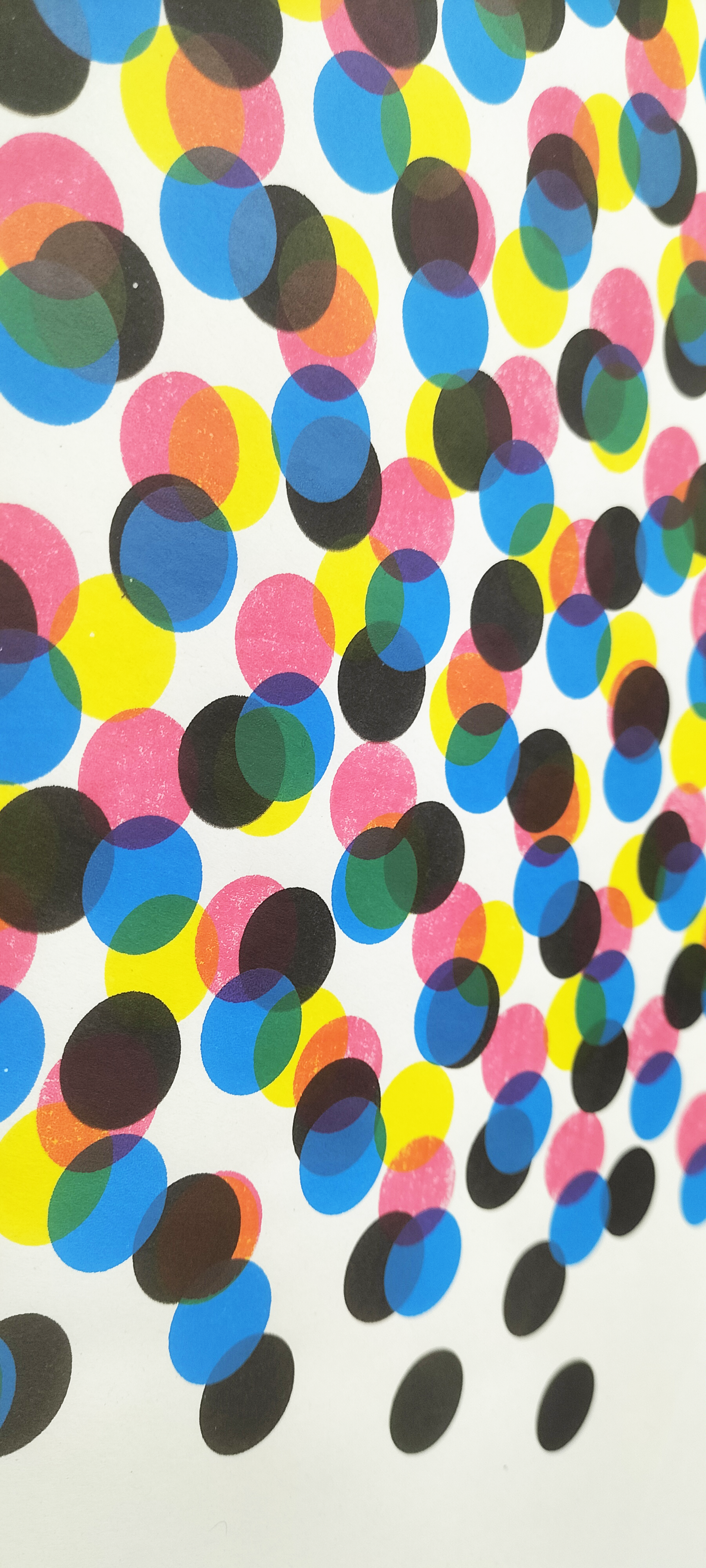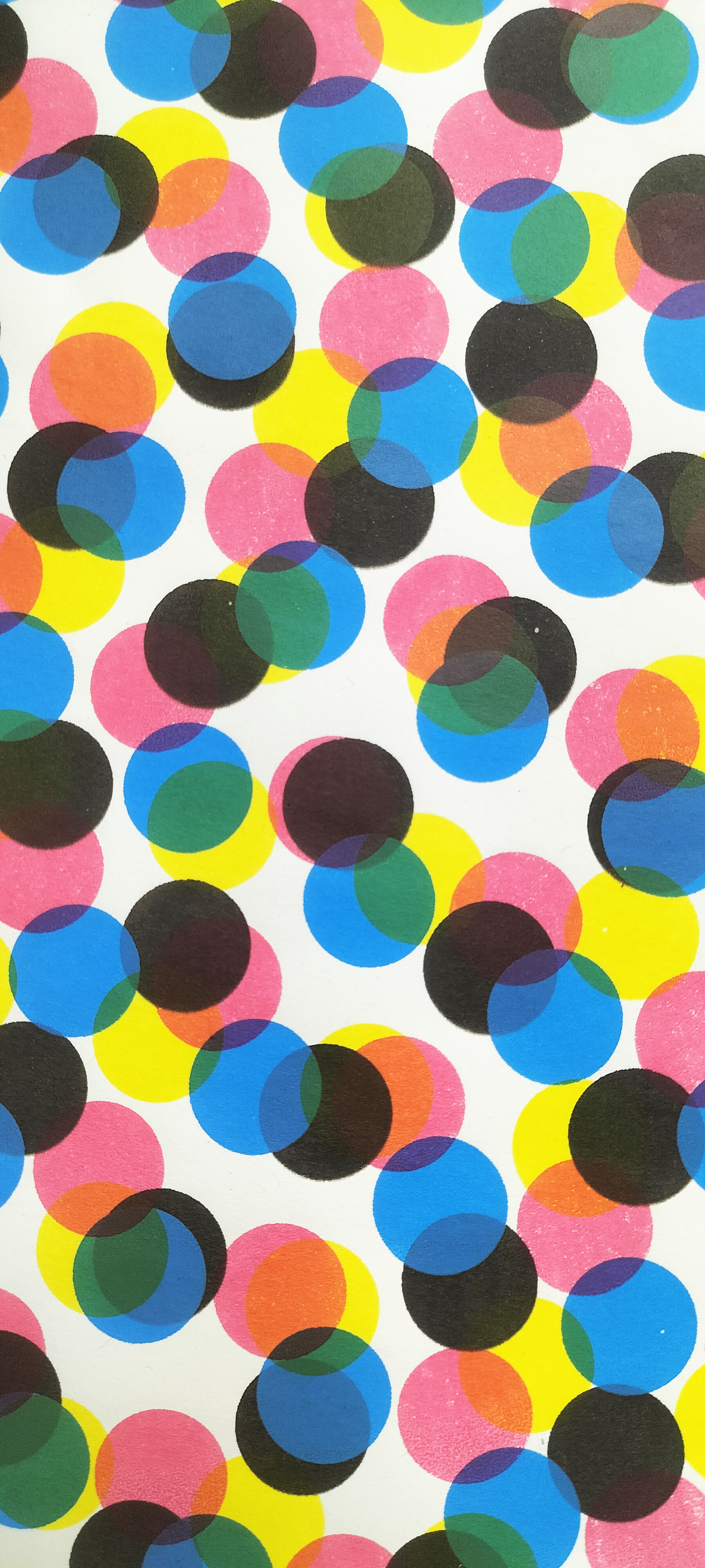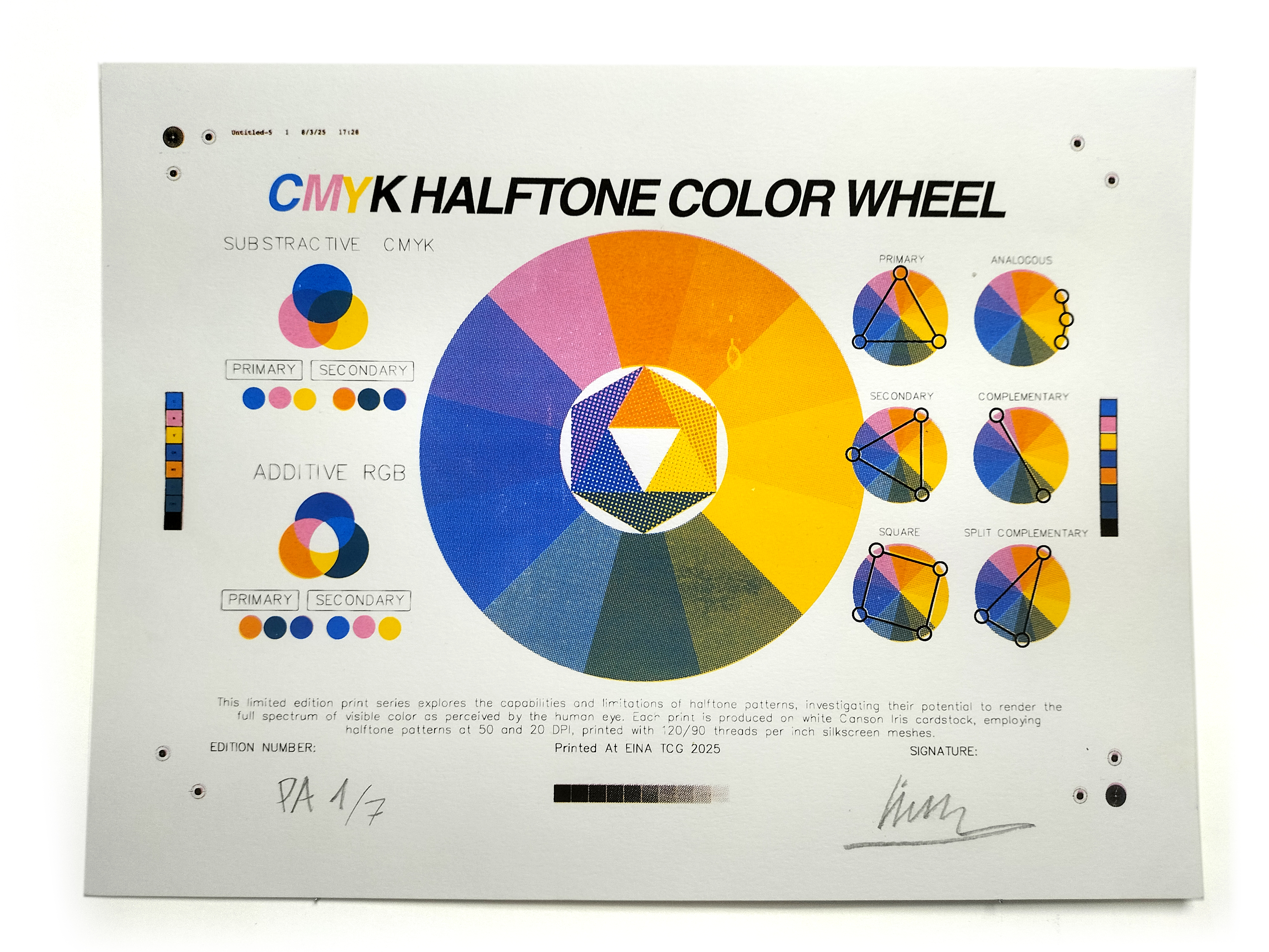 Aquesta peça és una prova de color serigràfica realitzada amb tintes Rittagraf per estudiar la cobertura, saturació i superposició de combinacions transparents i opaques sobre diversos papers. Mitjançant una roda de color impresa amb capes successives de cian, magenta i groc, es posa a prova la interacció entre les tintes segons l’ordre d’impressió, la densitat i el suport. Tot i tenir un propòsit tècnic, la composició també funciona com a peça visual autònoma i eina per afinar el llenguatge gràfic de futurs projectes.