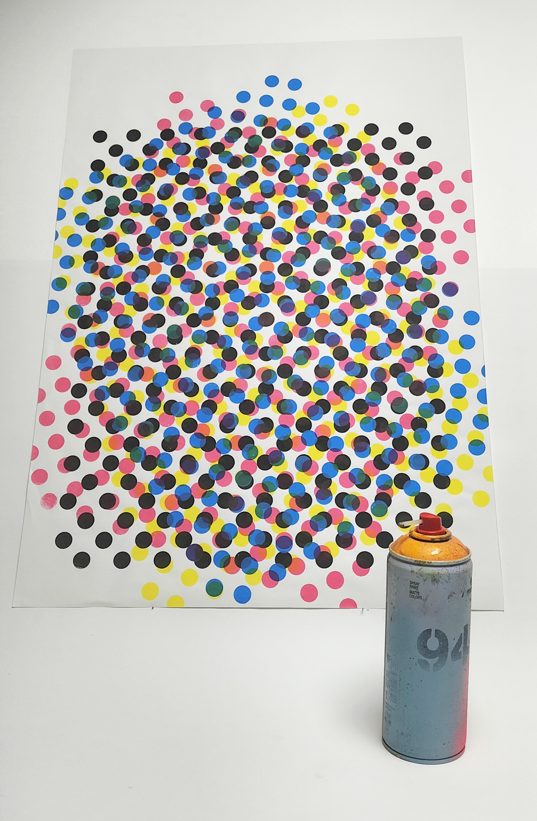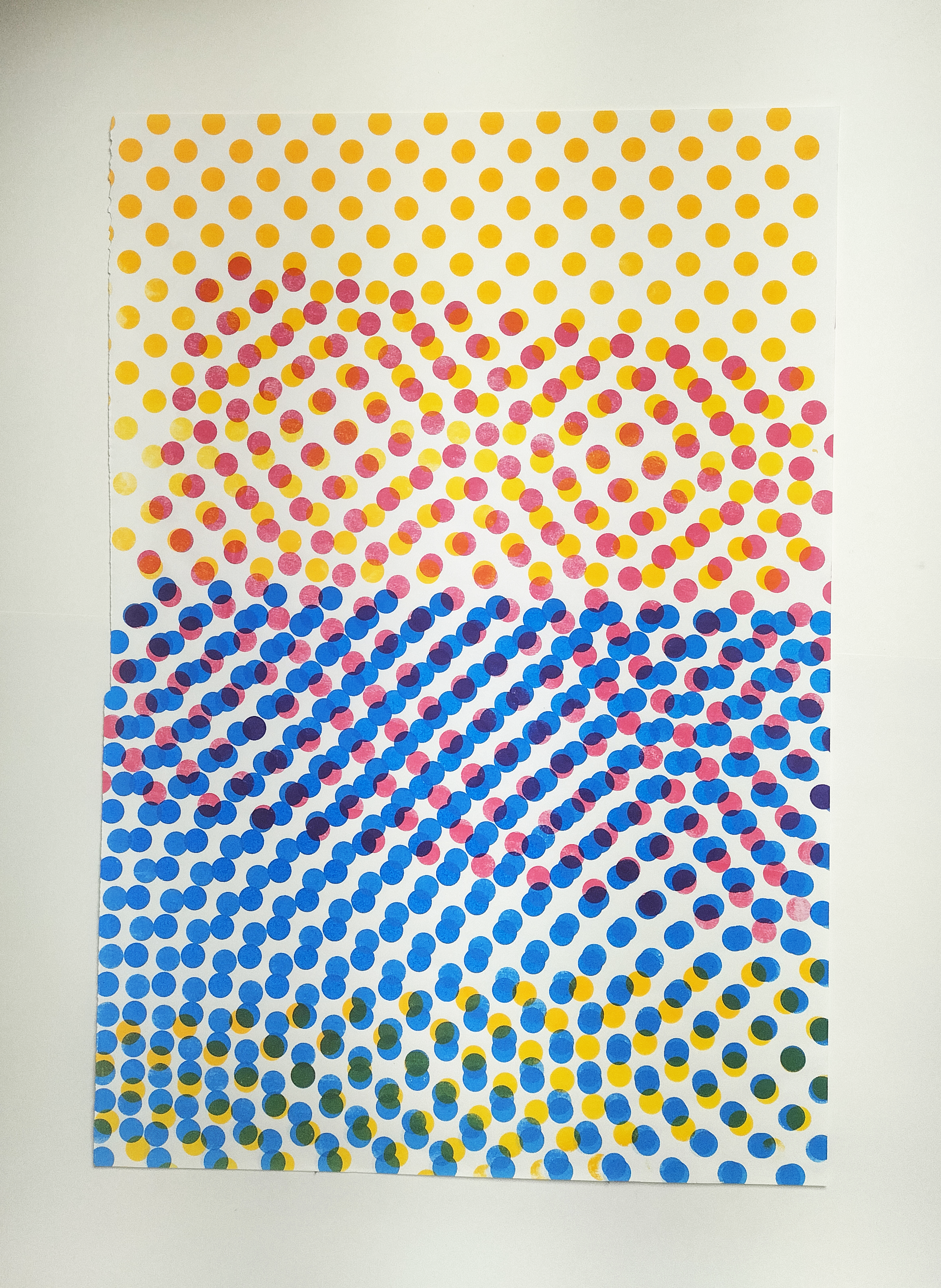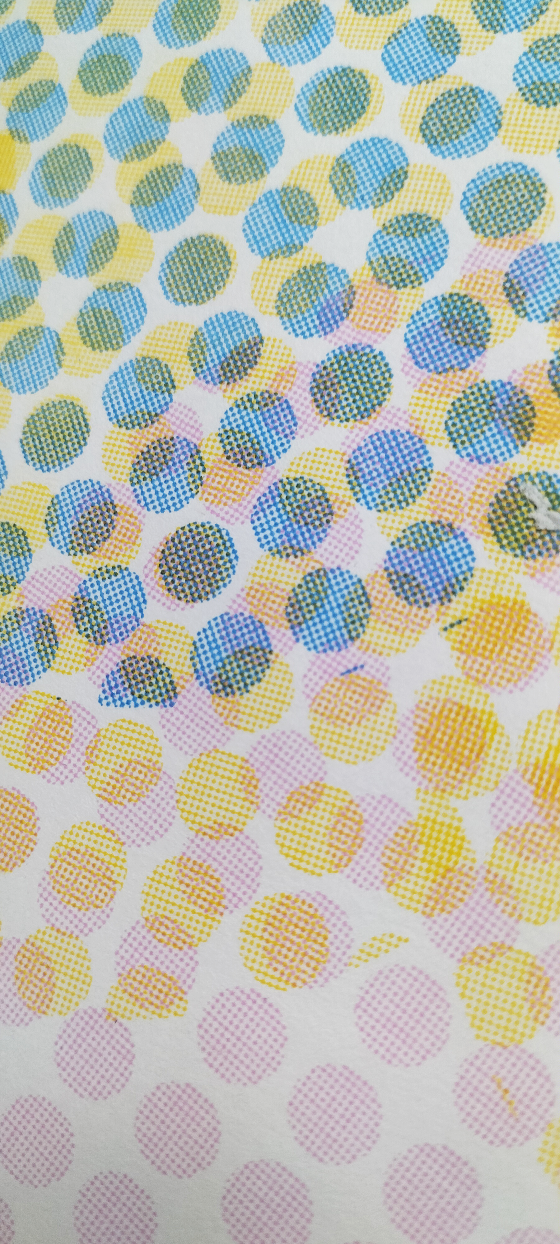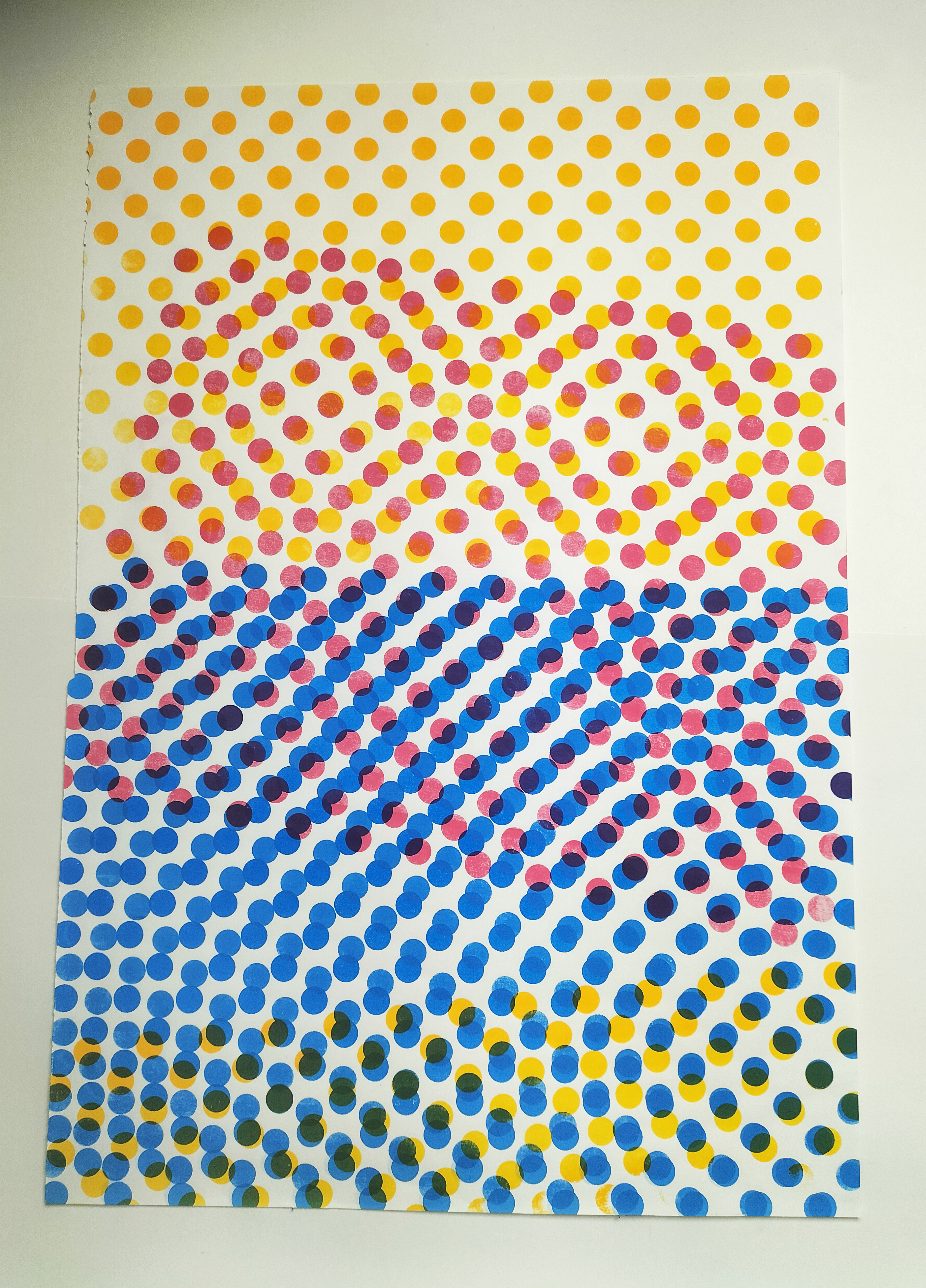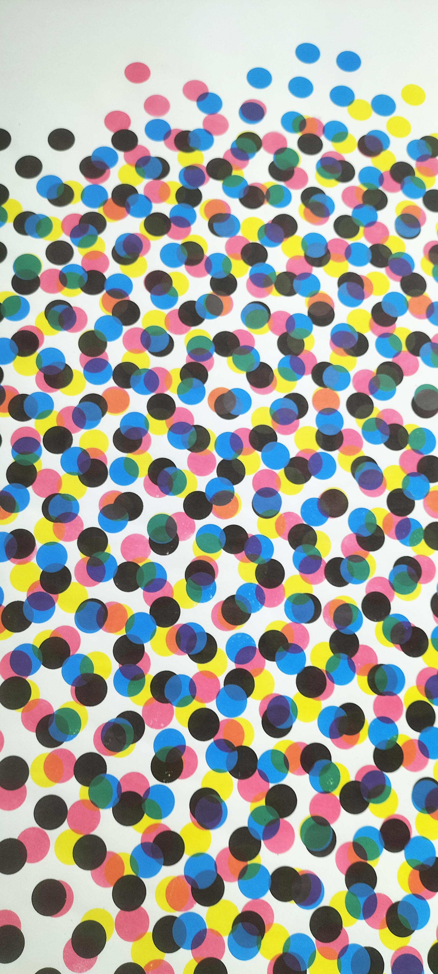 Aquesta peça és una prova de color serigràfica realitzada amb tintes Rittagraf per estudiar la cobertura, saturació i superposició de combinacions transparents i opaques sobre diversos papers. Mitjançant una roda de color impresa amb capes successives de cian, magenta i groc, es posa a prova la interacció entre les tintes segons l’ordre d’impressió, la densitat i el suport. Tot i tenir un propòsit tècnic, la composició també funciona com a peça visual autònoma i eina per afinar el llenguatge gràfic de futurs projectes.