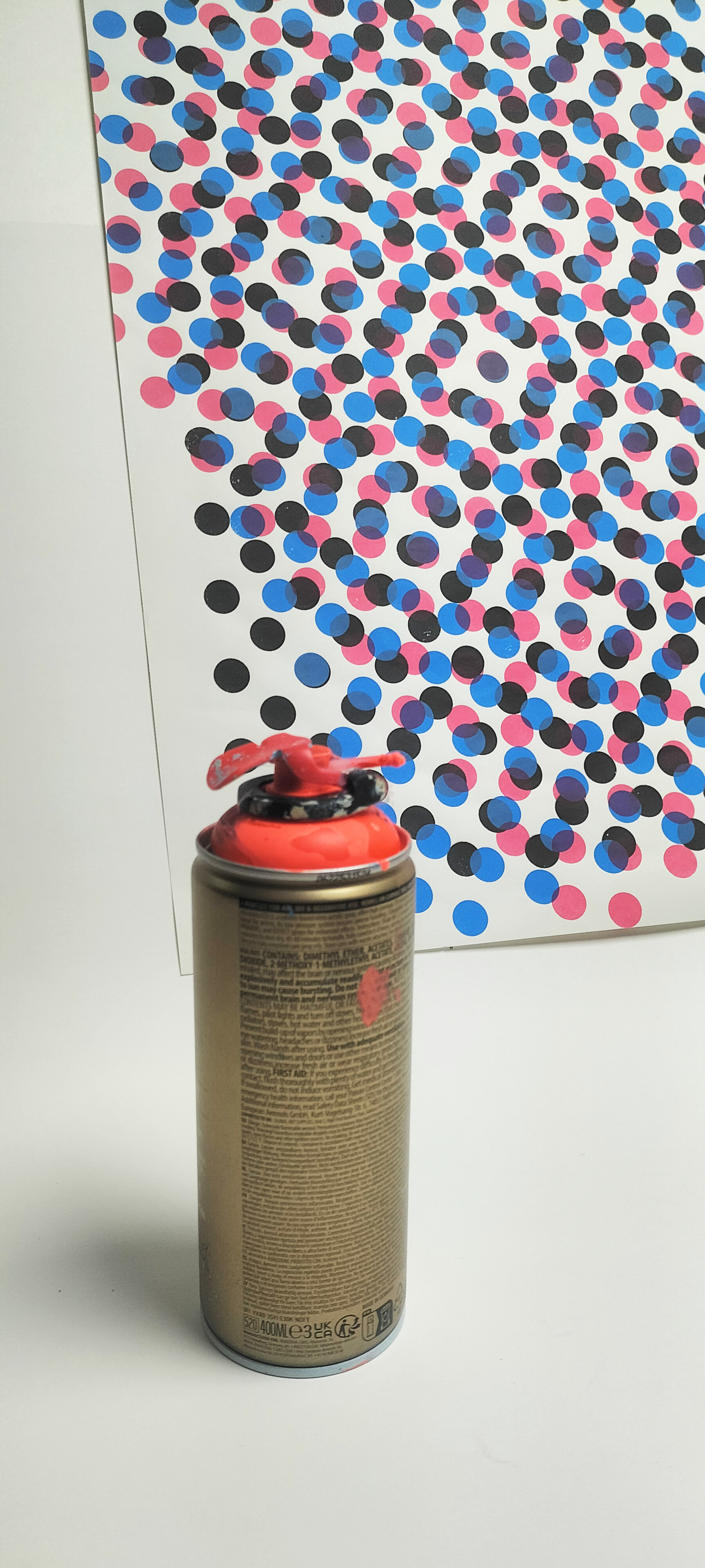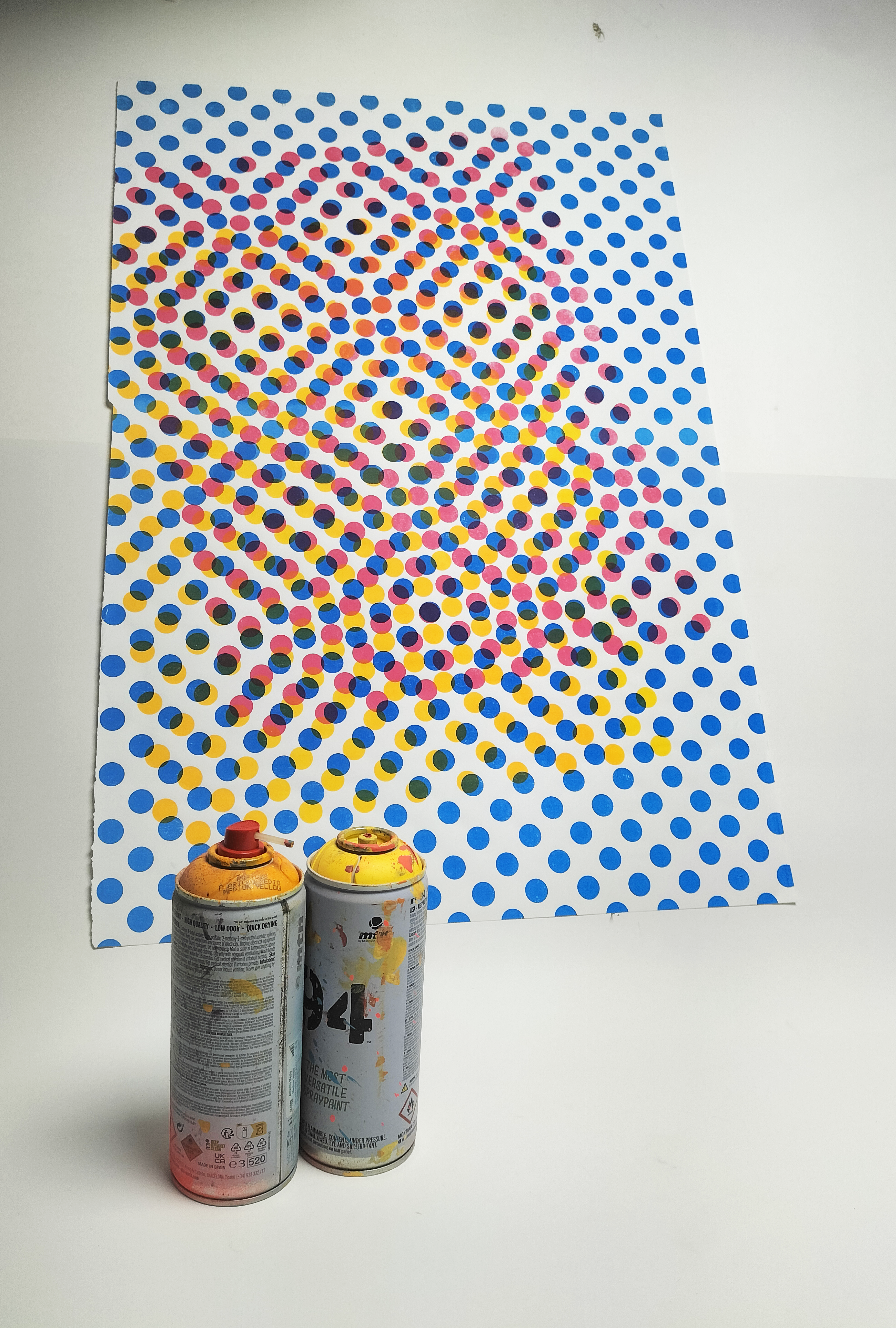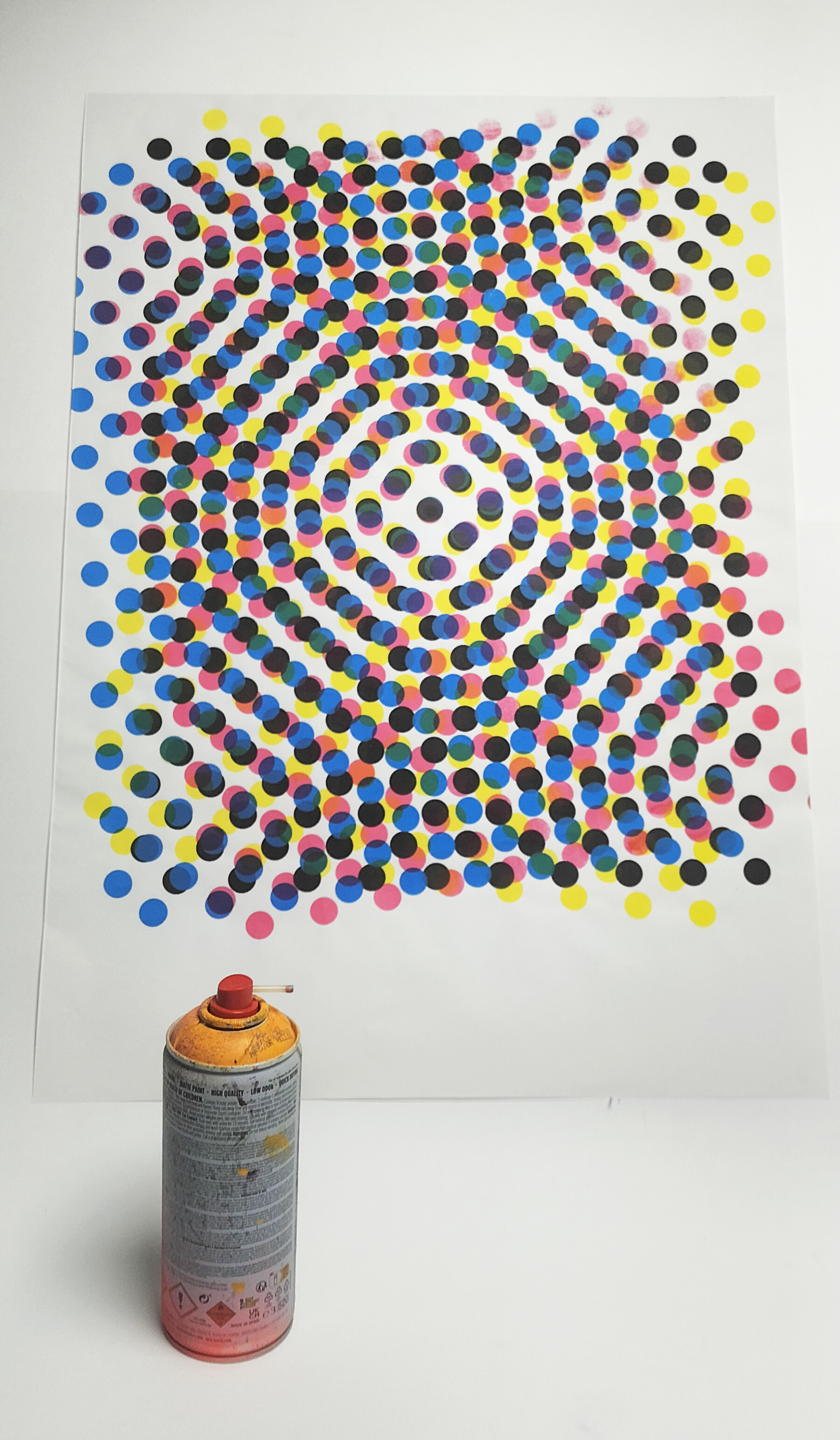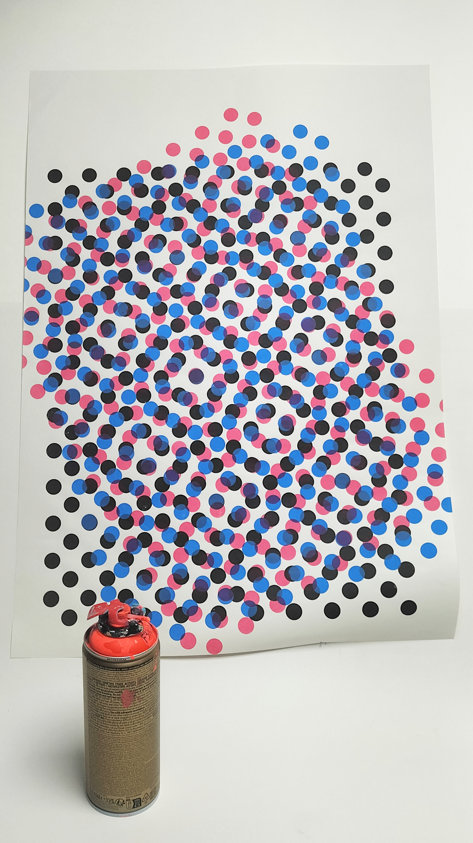 Aquesta peça és una prova de color serigràfica realitzada amb tintes Rittagraf per estudiar la cobertura, saturació i superposició de combinacions transparents i opaques sobre diversos papers. Mitjançant una roda de color impresa amb capes successives de cian, magenta i groc, es posa a prova la interacció entre les tintes segons l’ordre d’impressió, la densitat i el suport. Tot i tenir un propòsit tècnic, la composició també funciona com a peça visual autònoma i eina per afinar el llenguatge gràfic de futurs projectes.