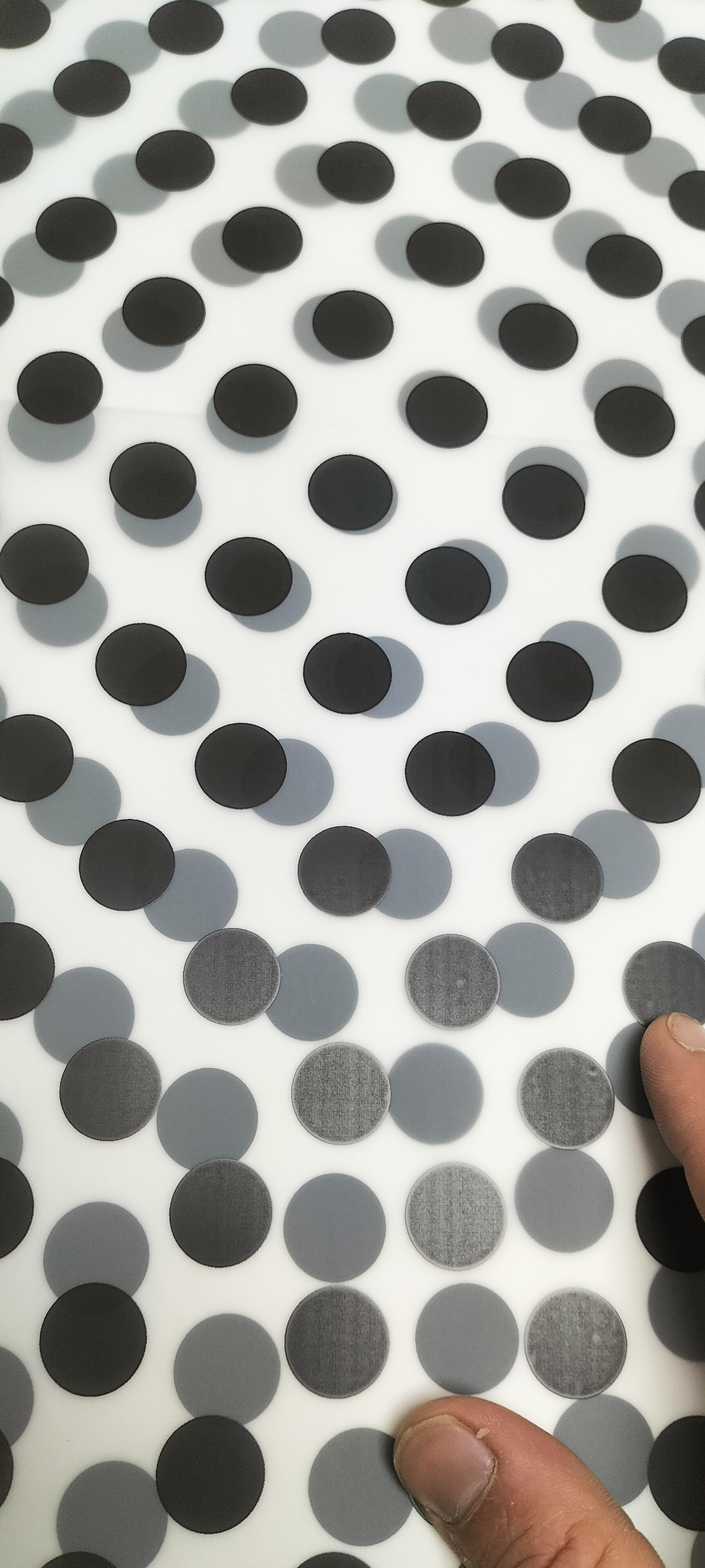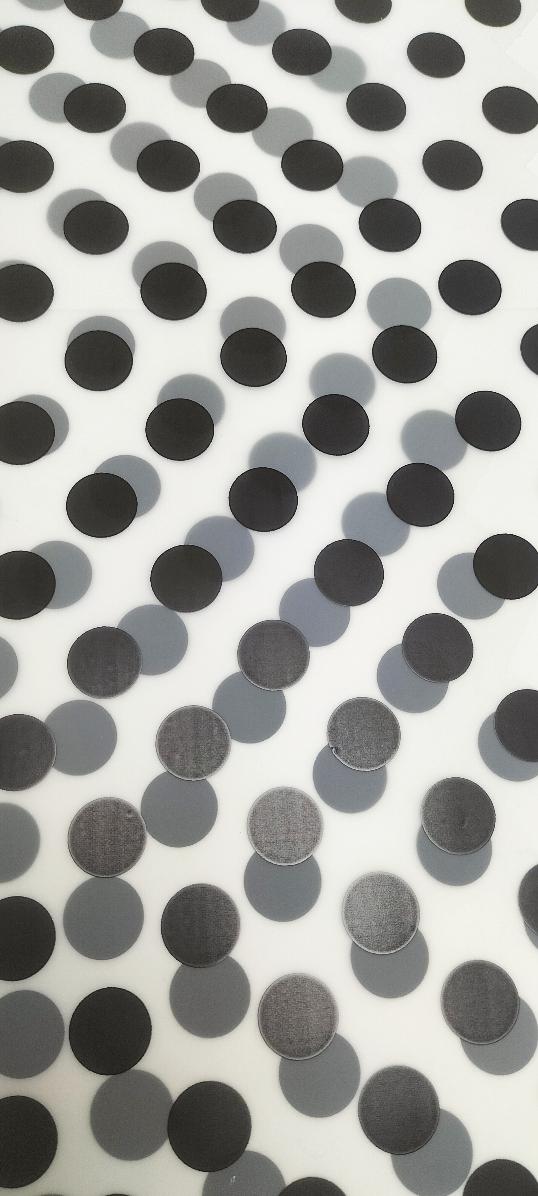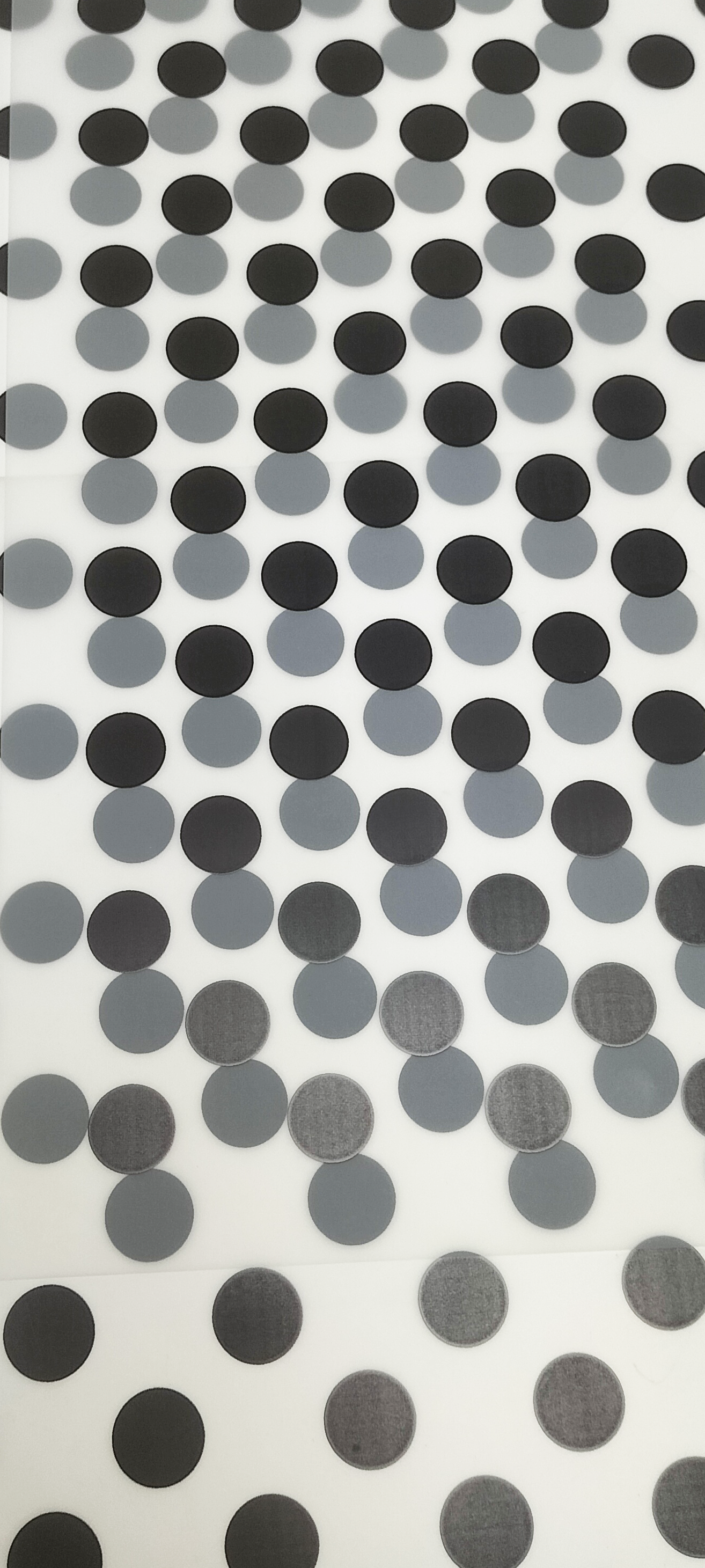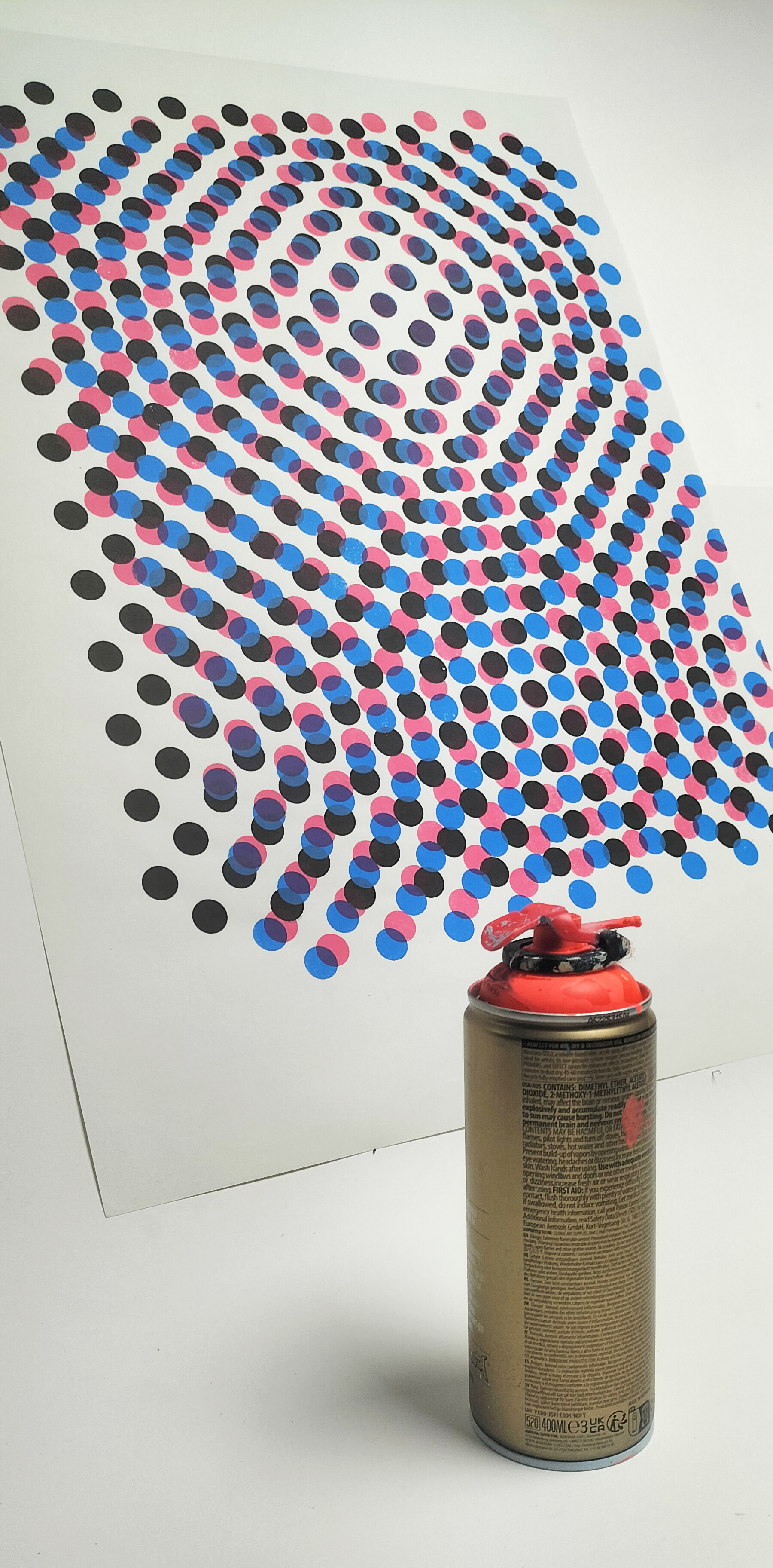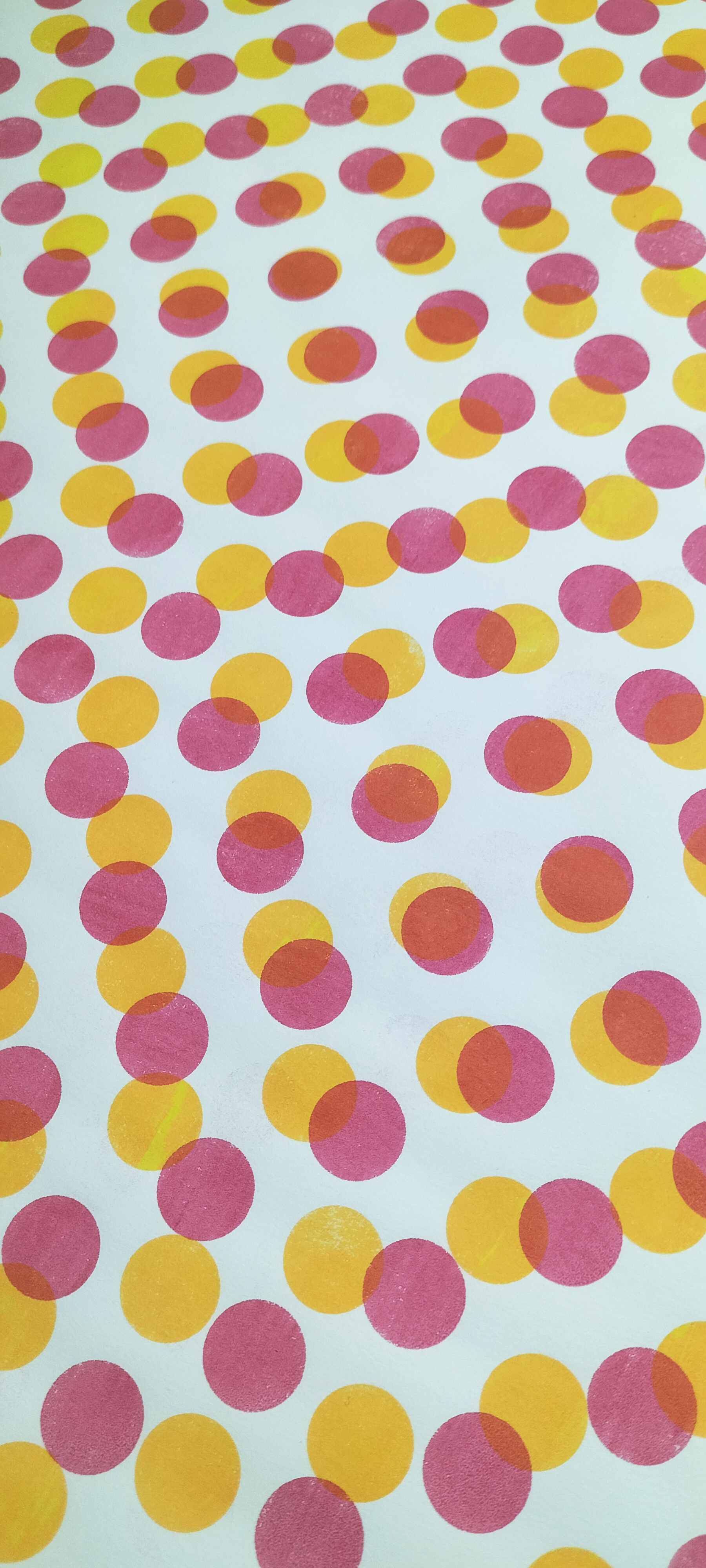 Aquesta peça és una prova de color serigràfica realitzada amb tintes Rittagraf per estudiar la cobertura, saturació i superposició de combinacions transparents i opaques sobre diversos papers. Mitjançant una roda de color impresa amb capes successives de cian, magenta i groc, es posa a prova la interacció entre les tintes segons l’ordre d’impressió, la densitat i el suport. Tot i tenir un propòsit tècnic, la composició també funciona com a peça visual autònoma i eina per afinar el llenguatge gràfic de futurs projectes.