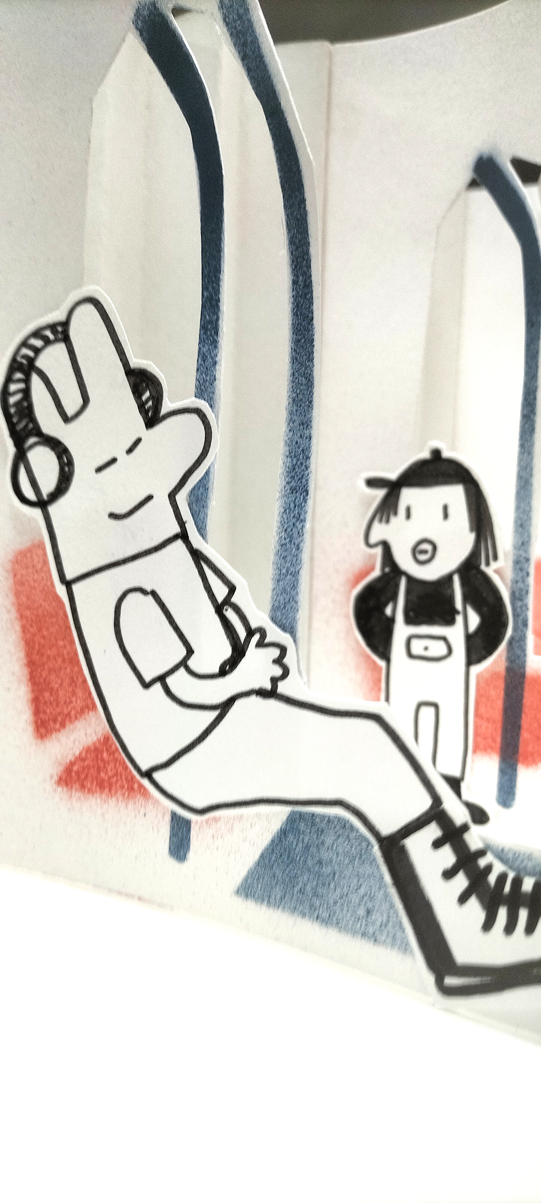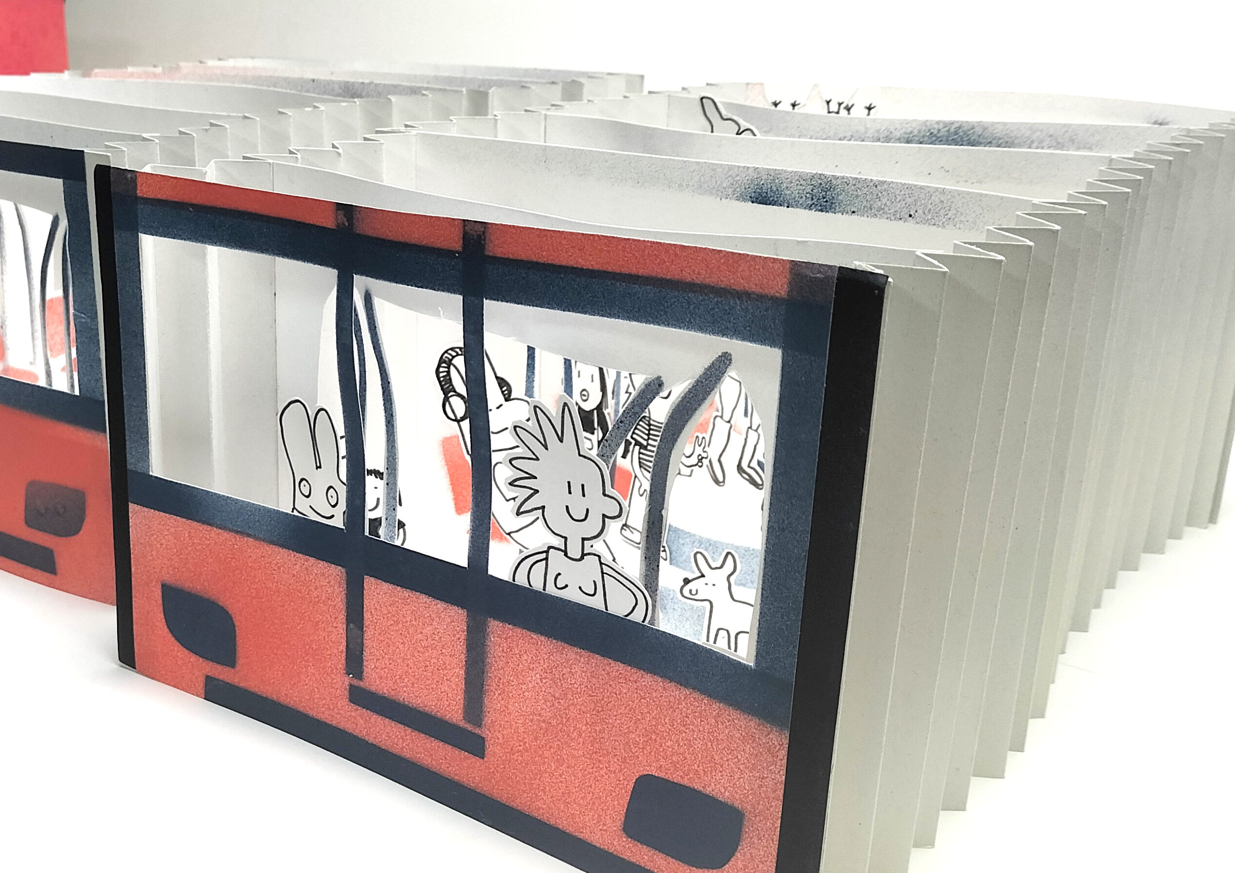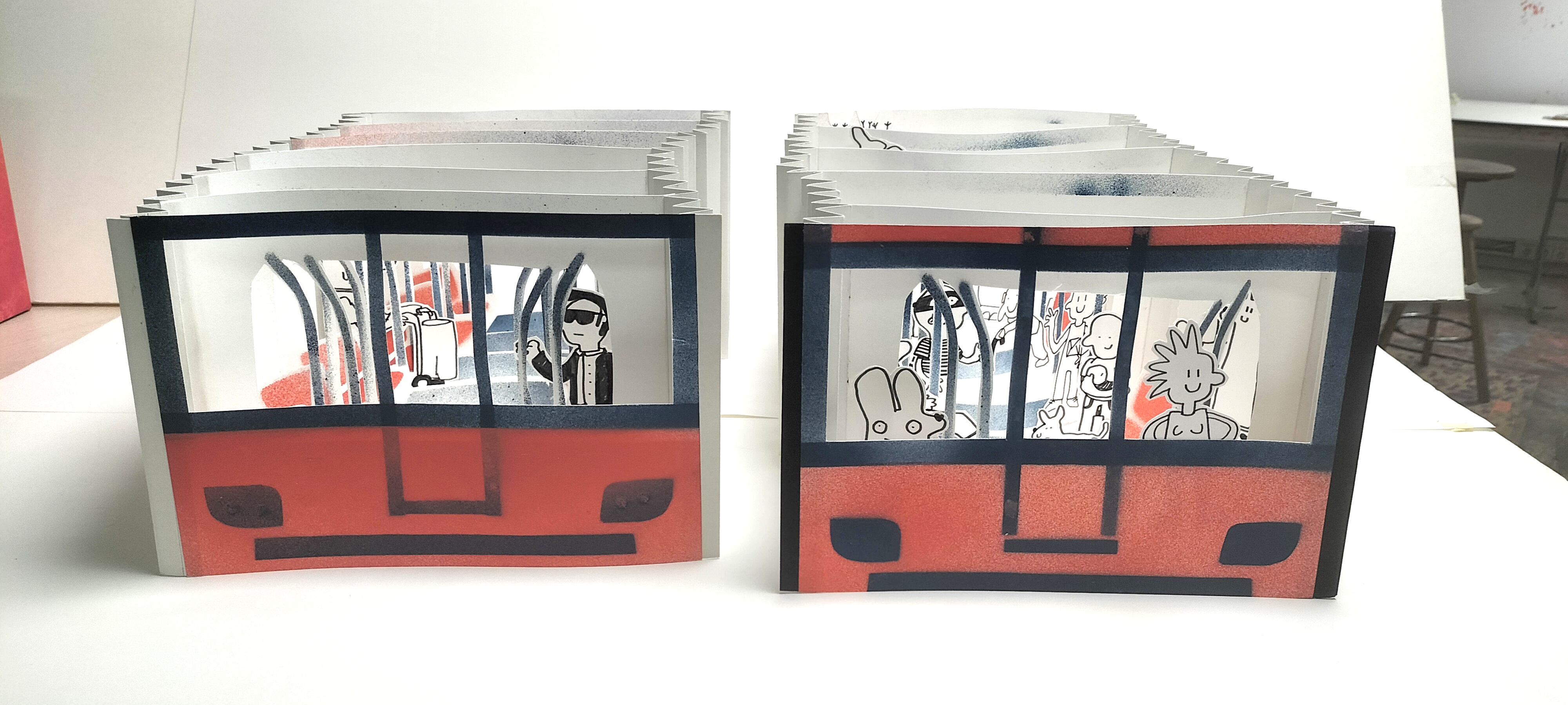 El llibre està pintat amb esprai i plantilles (stencils), combinant tècniques manuals amb un format tridimensional. Es tracta d’un projecte personal que posa el focus en la varietat de persones que podem trobar en un vagó de metro. Amb aquesta peça, poso en valor la diversitat de persones que conviuen en un mateix espai públic i quotidià.