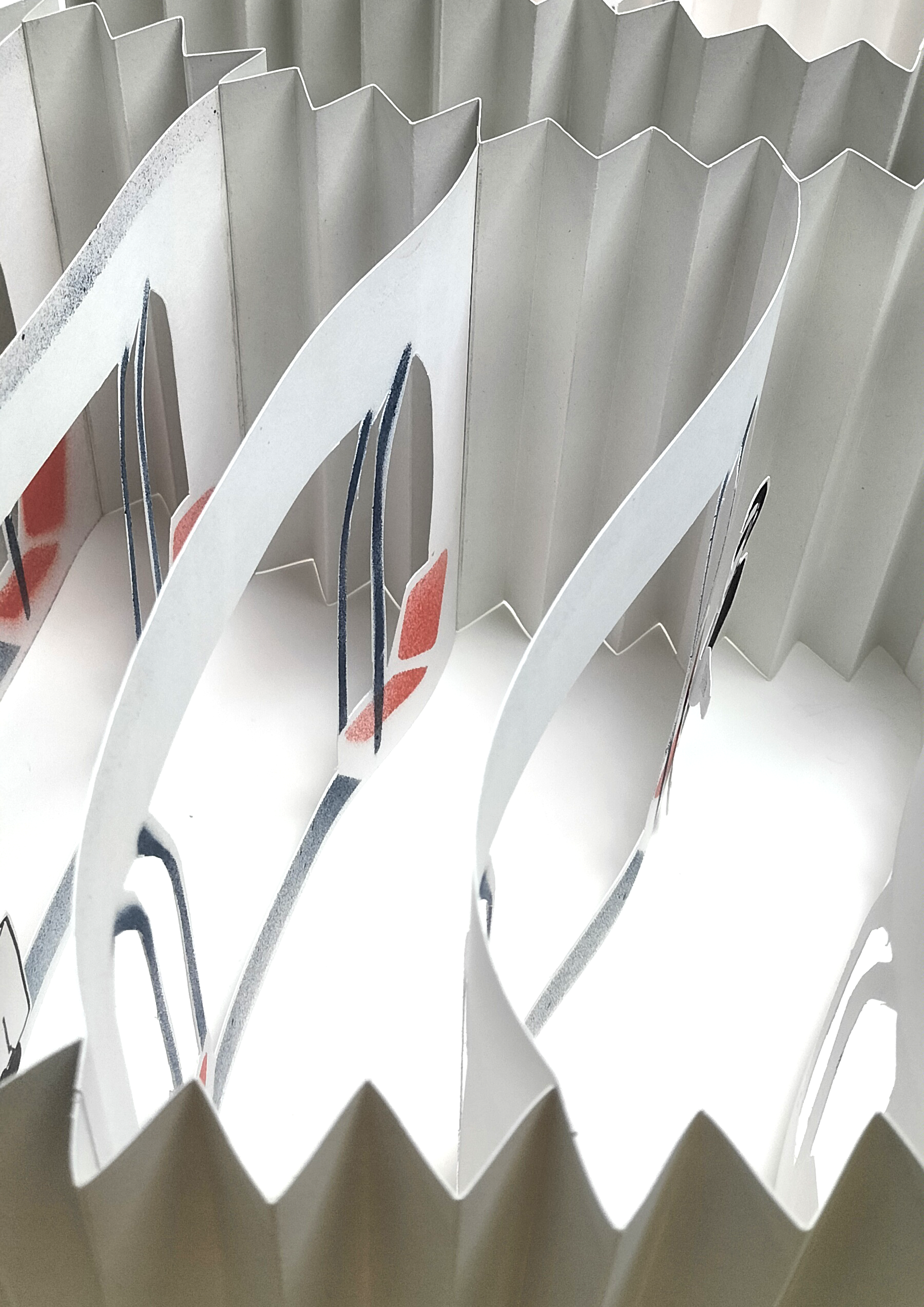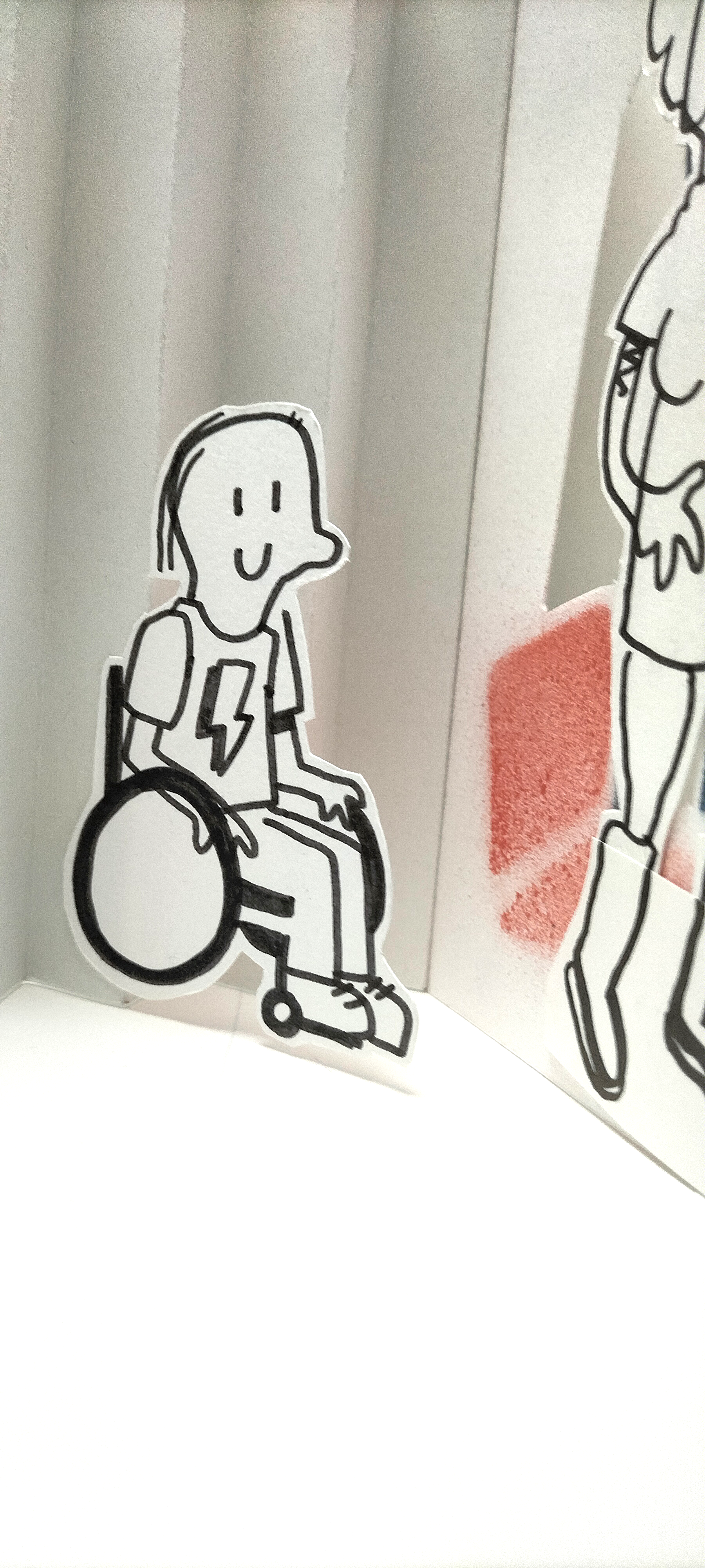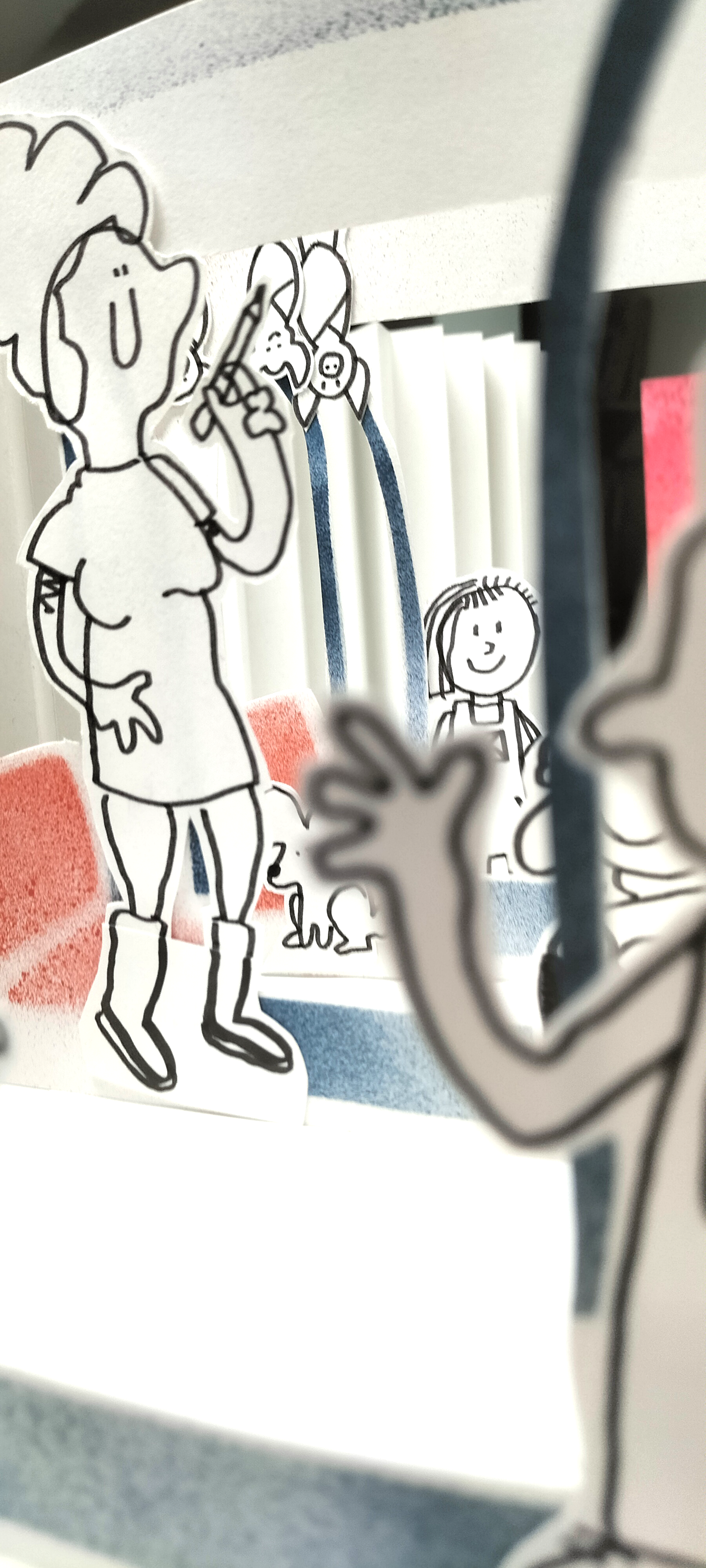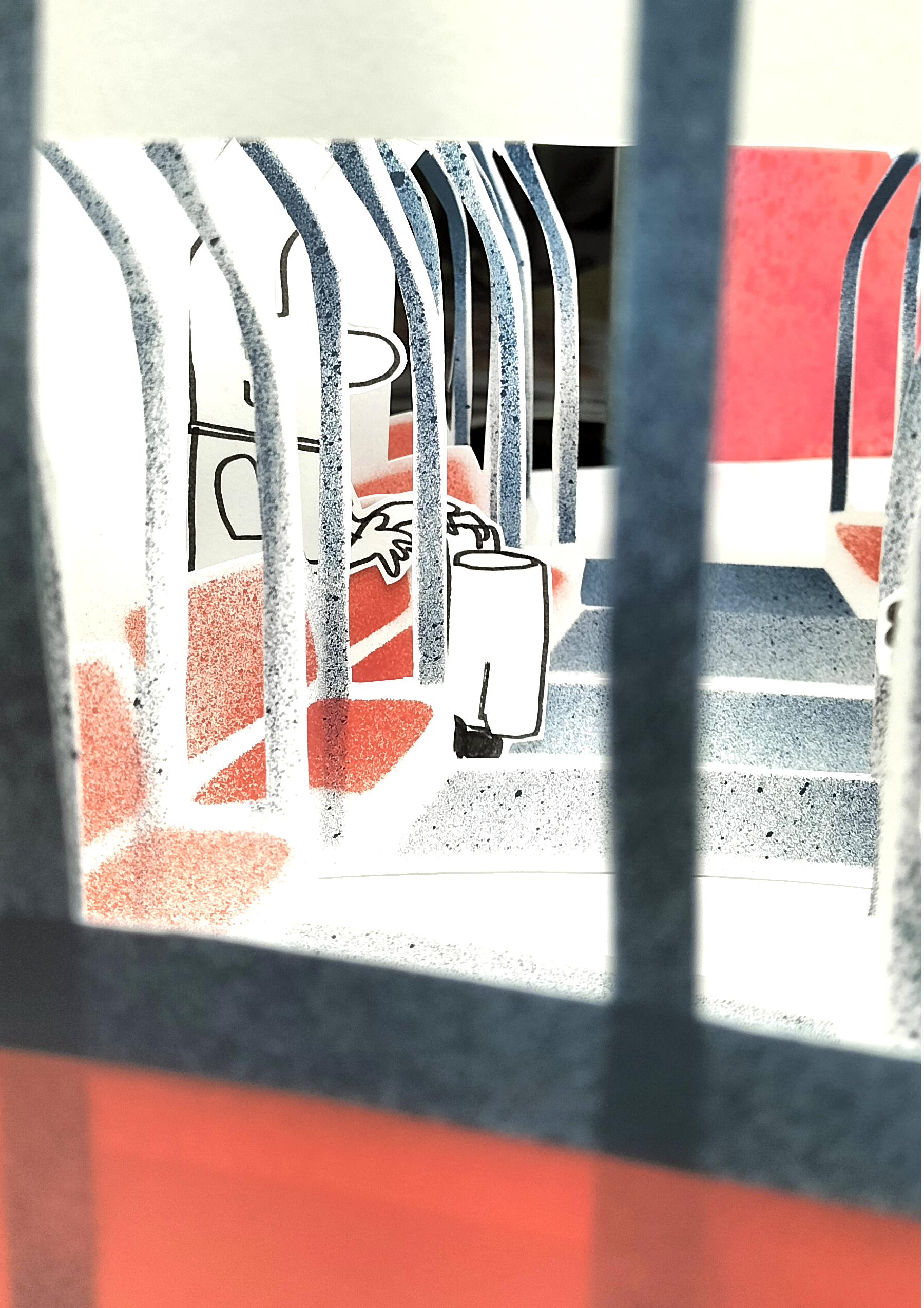El llibre està pintat amb esprai i plantilles (stencils), combinant tècniques manuals amb un format tridimensional. Es tracta d’un projecte personal que posa el focus en la varietat de persones que podem trobar en un vagó de metro. Amb aquesta peça, poso en valor la diversitat de persones que conviuen en un mateix espai públic i quotidià.