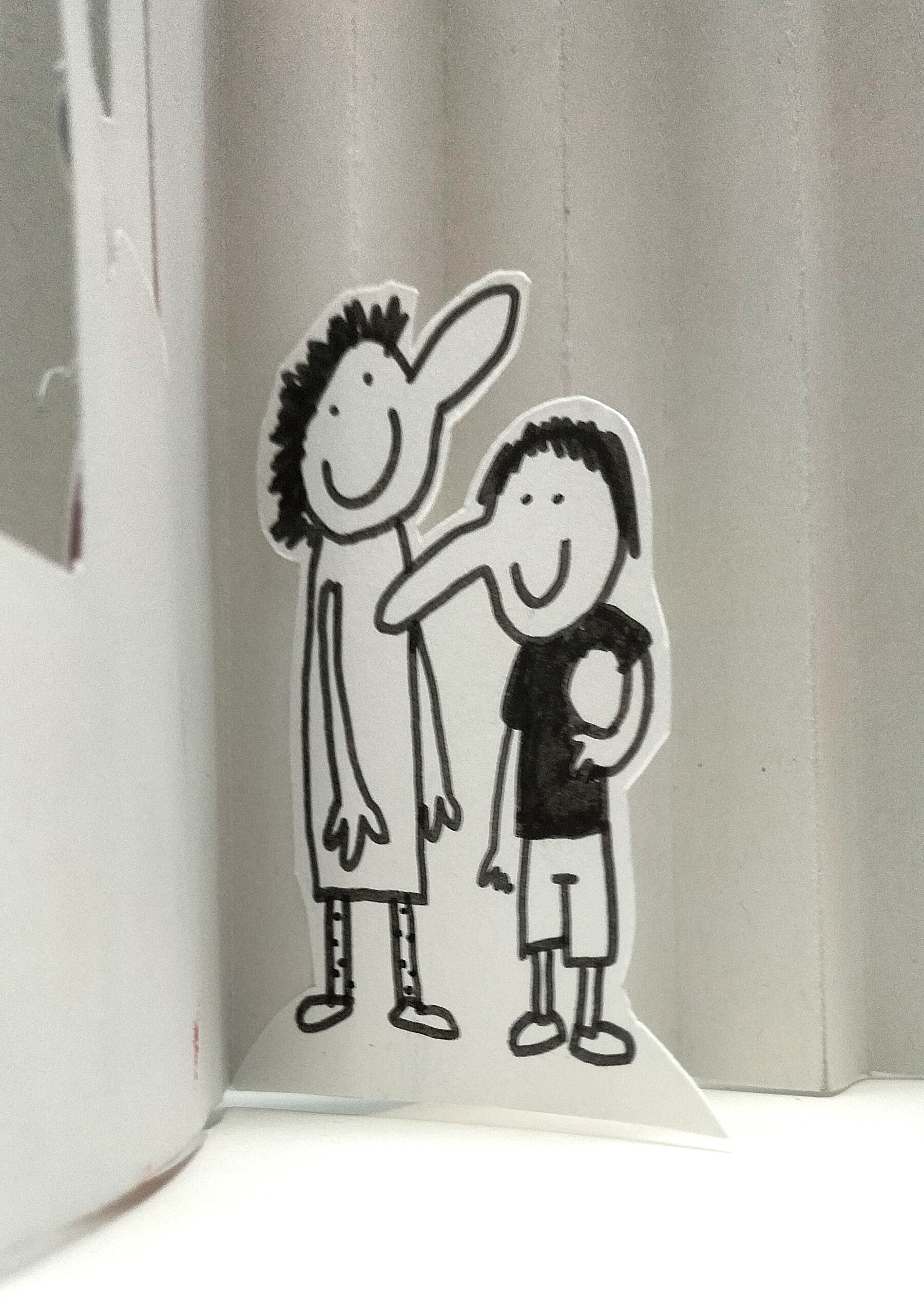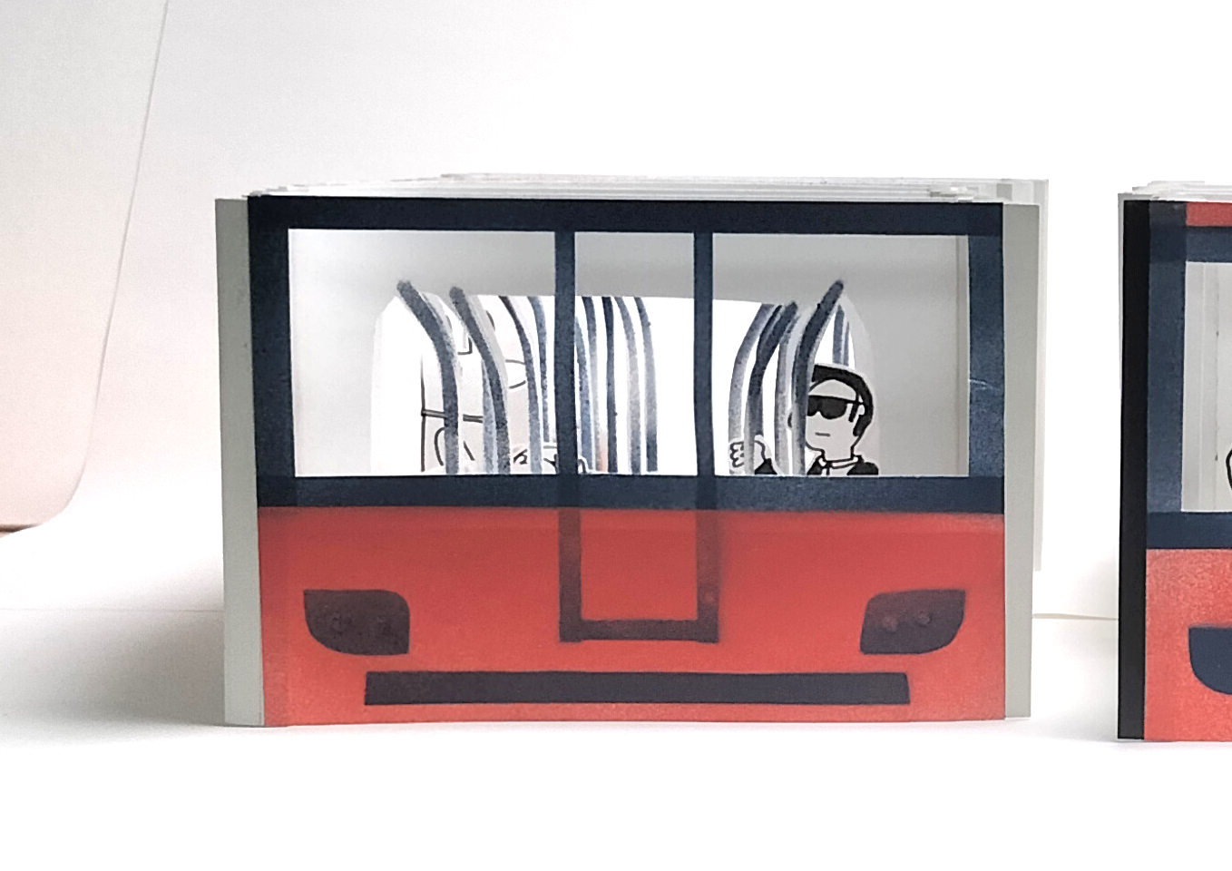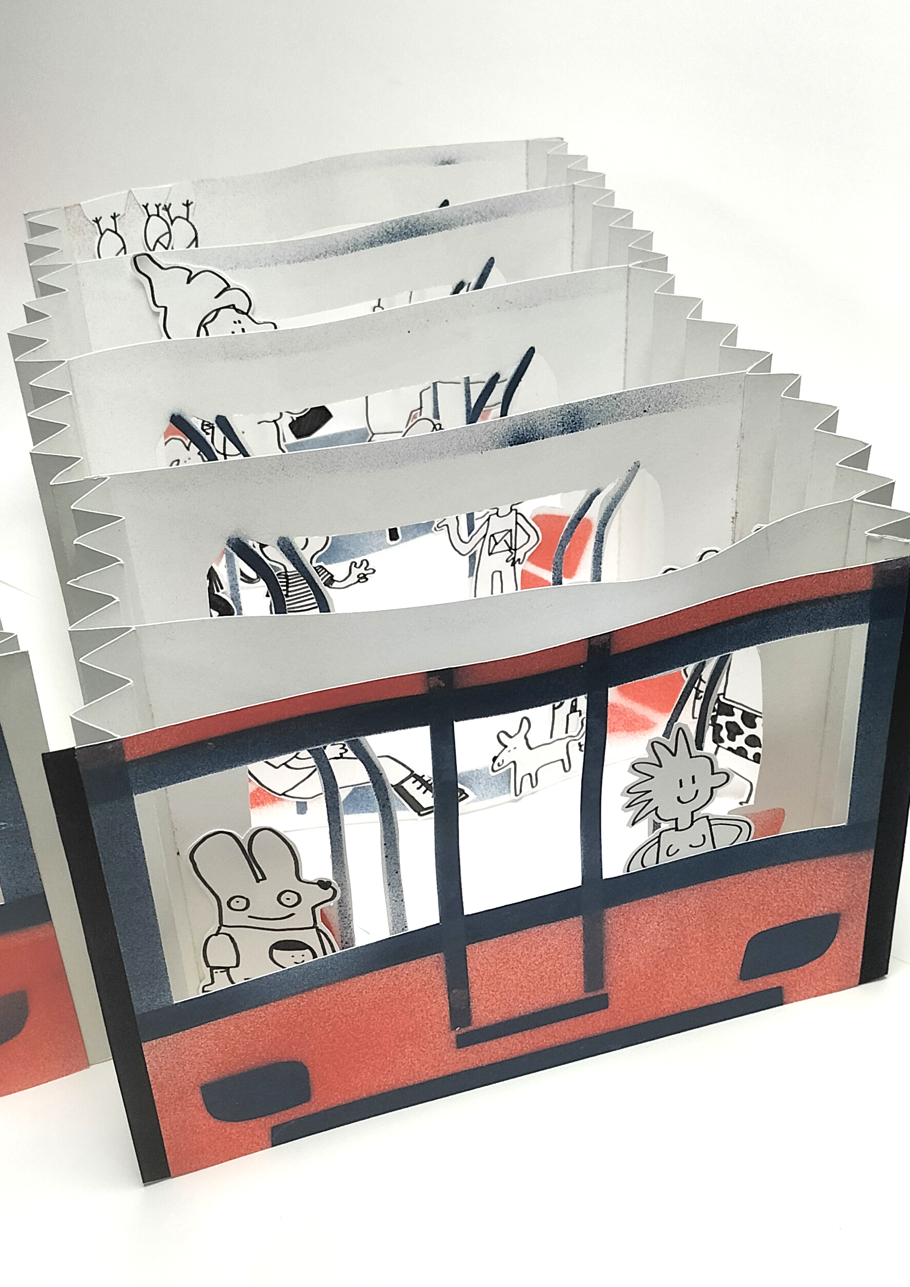 Metro Llibre / Túnel és un llibre objecte fet íntegrament de paper, amb forma de vagó de metro. Cada pàgina té una obertura que permet veure a través de tot el llibre, creant un efecte de túnel. A l’interior, s’hi distribueixen personatges pintats amb retolador, retallats i enganxats a cada pàgina, generant una escena en profunditat que es revela en mirar-hi de front.