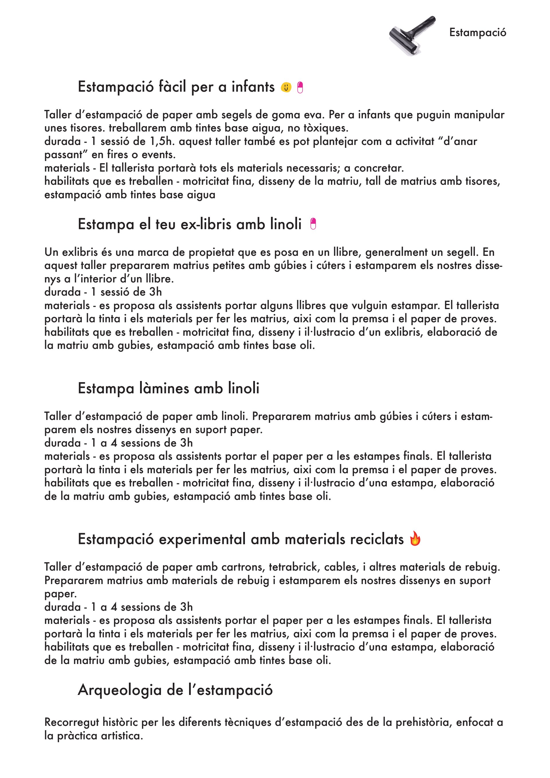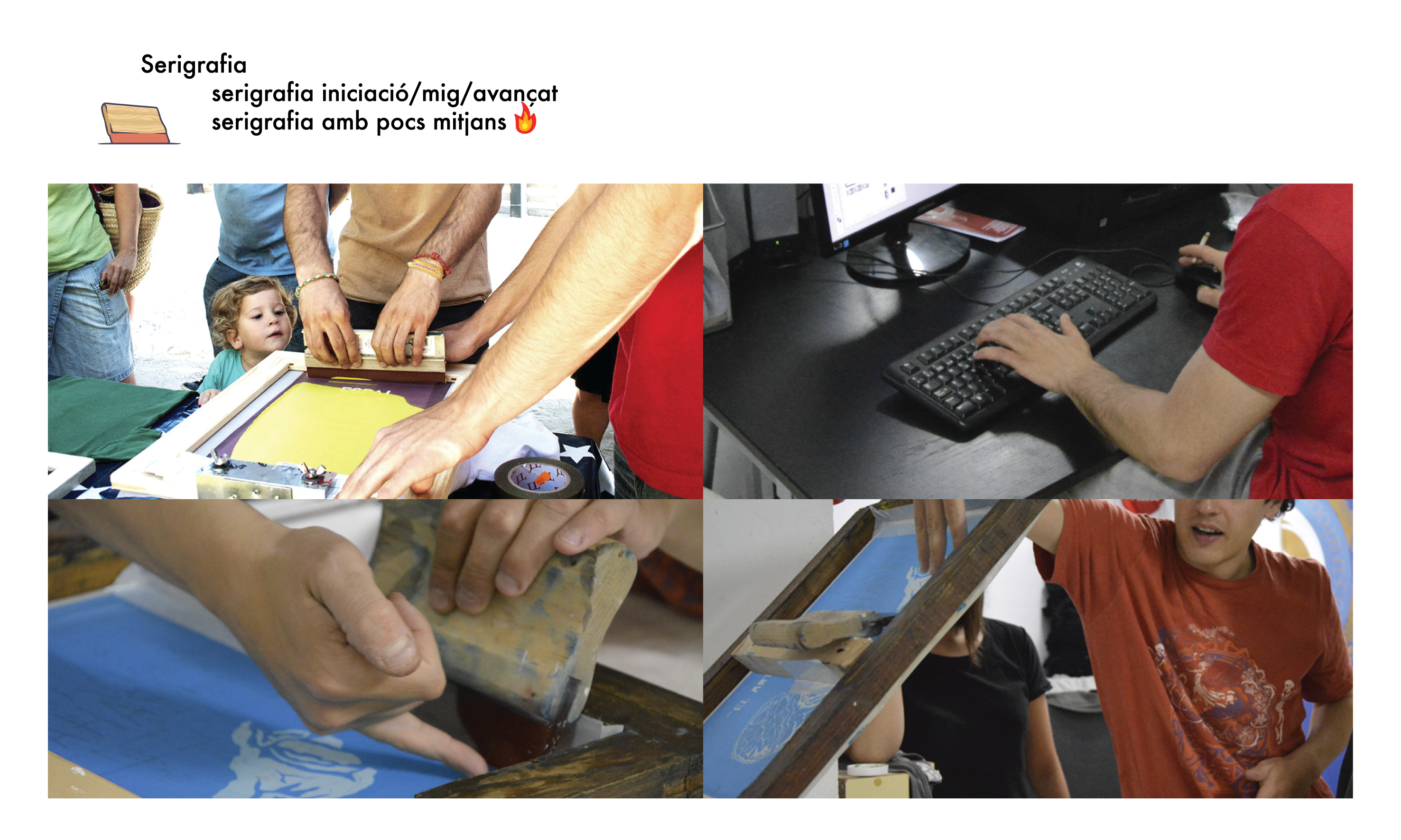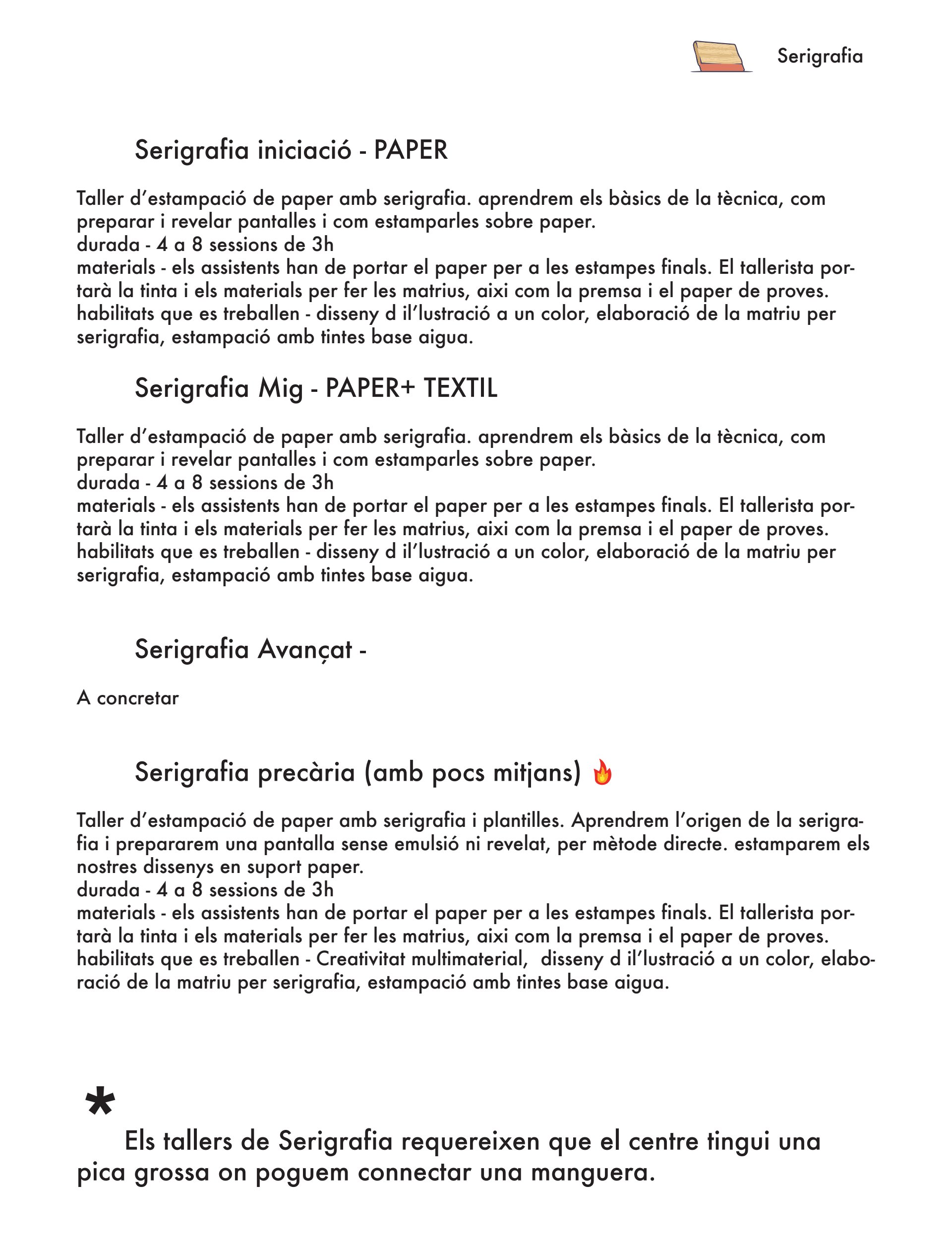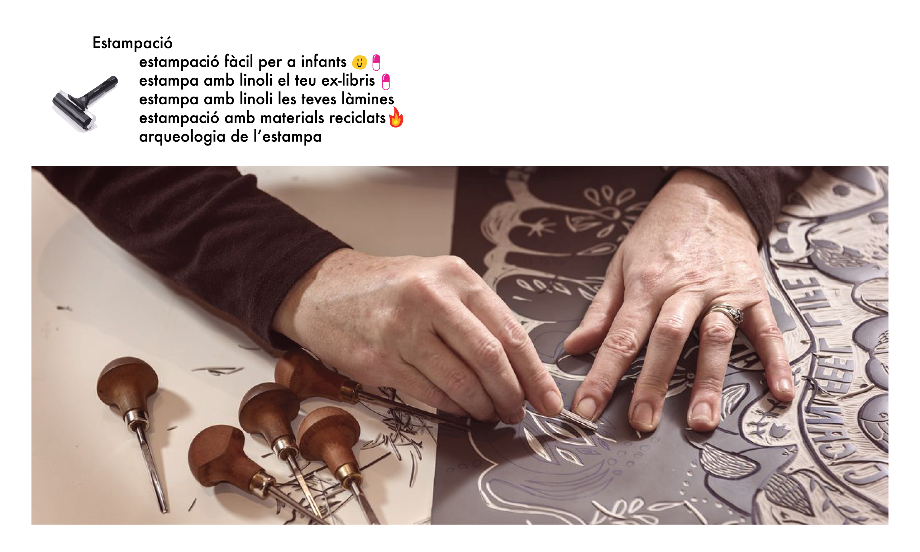 Imparteixo tallers pràctics de serigrafia, gravat, estampació i altres tècniques gràfiques, adaptats a diferents edats i nivells. Treballo habitualment amb escoles, instituts, centres cívics i espais culturals, combinant creativitat, experimentació i coneixement tècnic.