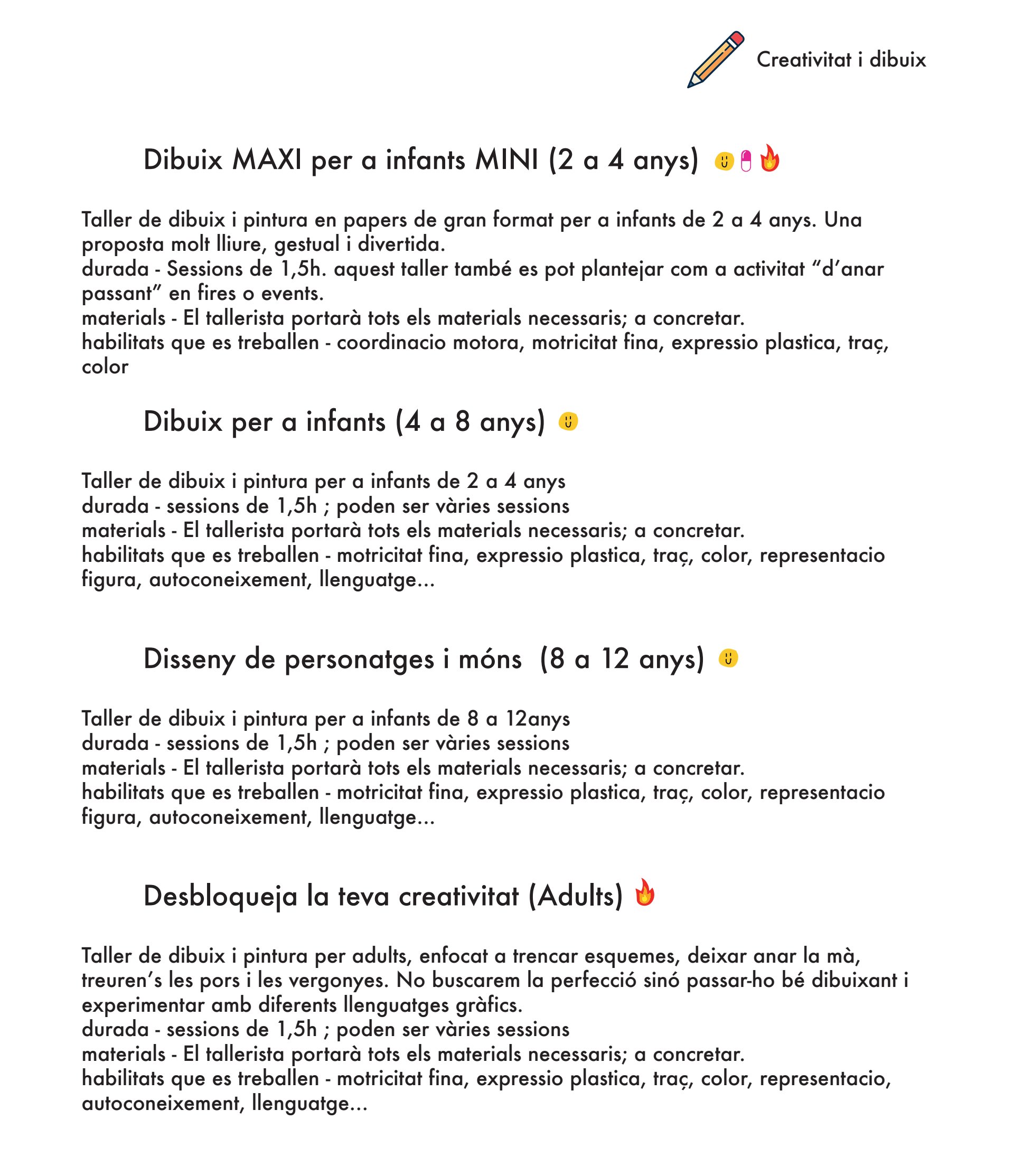 Els tallers poden ser puntuals o formar part de programes més llargs. Si vols portar una activitat artística al teu centre, no dubtis a posar-te en contacte. Podem dissenyar una proposta a mida segons les necessitats del grup